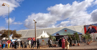 When we went up to the dam we noticed some enormous buildings being built to the north of the town. We could not understand what it was, steel frameworks for hangar-like buildings on a monster scale. Then when we got back from the Draa there were signs on the lamposts all round the town.